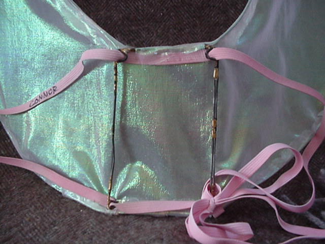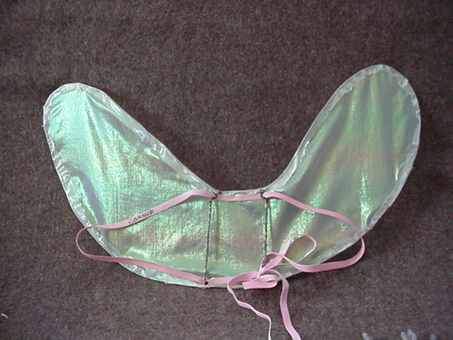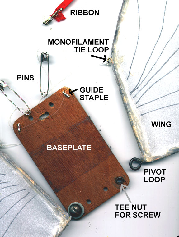 The wings are fastened to a wooden baseplate with pivots at the bottom corners were pinned to the actor's back and covered with a fabric piece that matched the jacket or cape. The edges were loosely folded in, and around the wings which were hanging down. This makes a sort of inverted box pleat around the wings. When the ribbon is pulled, the wings raise and pop out from under the covering fabric. If the ribbon is passed under a belt or something similar there will probably be enough friction to keep them up. Otherwise you will have to provide an anchor of some sort for the end of the ribbon.
